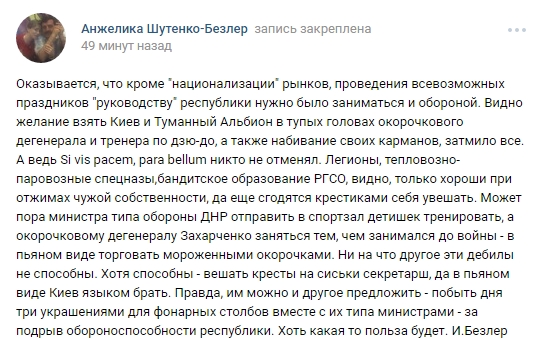 "Оказывается, что кроме "национализации" рынков, проведения всевозможных праздников "руководству" республики нужно было заниматься и обороной. Видно желание взять Киев и Туманный Альбион в тупых головах окорочкового дегенерала и тренера по дзю-до, а также набивание своих карманов, затмило все. А ведь Si vis pacem, para bellum никто не отменял. Легионы, тепловозно-паровозные спецназы,бандитское образование РГСО, видно, только хороши при отжимах чужой собственности, да еще сгодятся крестиками себя увешать. Может пора министра типа обороны ДНР отправить в спортзал детишек тренировать, а окорочковому дегенералу Захарченко заняться тем, чем занимался до войны - в пьяном виде торговать мороженными окорочками. Ни на что другое эти дебилы не способны. Хотя способны - вешать кресты на сиськи секретарш, да в пьяном виде Киев языком брать. Правда, им можно и другое предложить - побыть дня три украшениями для фонарных столбов вместе с их типа министрами - за подрыв обороноспособности республики. Хоть какая то польза будет", - пишет террорист.