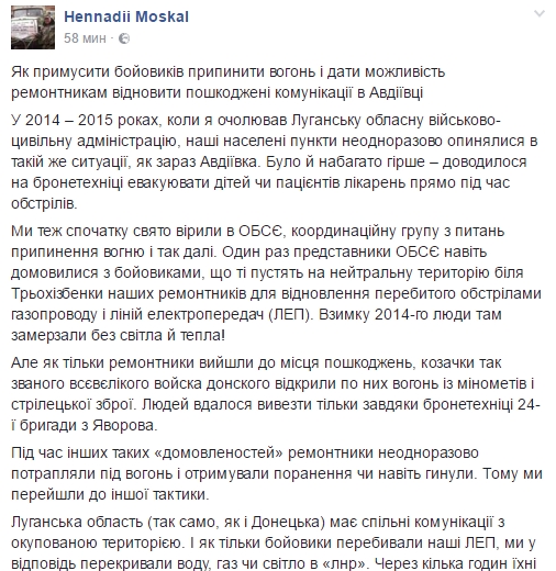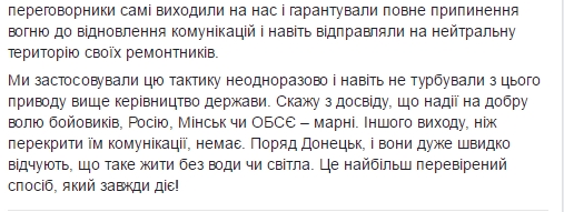 По его словам Луганская область (как и Донецкая) имеет общие коммуникации с ОРДЛО", и как только террористы перебивали ЛЭП, в ответ прекращалась подача газа, воды и света на неподконтрольную территорию. Через несколько часов боевики сами выходили на властей Луганщины, гарантировали полное прекращение обстрелов и даже отправляли своих ремонтников в серую зону.