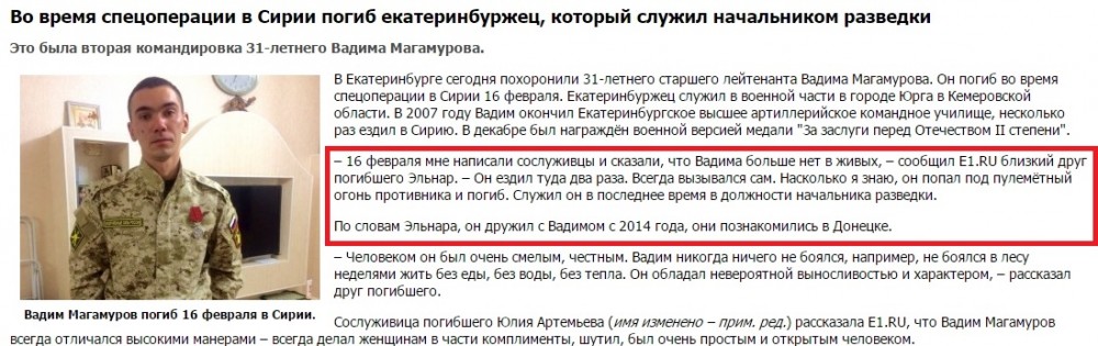 20 февраля, в Екатеринбурге (РФ) похоронили 31-летнего старшего лейтенанта Вадима Магамурова. Россиянин погиб 16 февраля в Сирии.