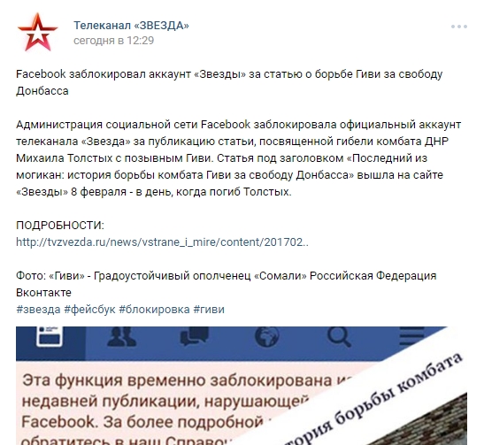 Администрация соцсети Facebook заблокировала официальный аккаунт пропагандистского телеканала "Звезда". Причиной тому послужила за публикация статьи, посвященной ликвидированному главарю "Сомали" по кличке "Гиви".