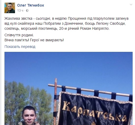 26 февраля, в зоне проведения антитеррористической операции погиб 20-летний морпех, уроженец Донецкой области Роман Напрягло.