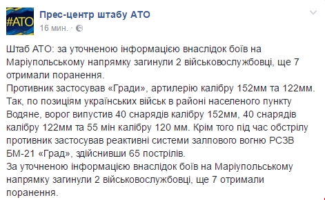 В штабе уточнили информацию. Согласно сообщению от 16:07, погибли двое украинских бойцов, ранения получили семеро.