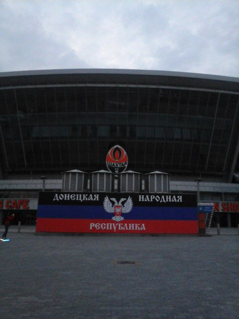 Террористы внесли инновации во внешний вид, когда-то одного из самых посещаемых стадионов Европы, растянув у входа огромную символику группировки.