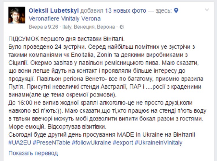 В Вероне, Италия, прошла выставка вина, которой руководил украинец Алексей Любецкий. Россияне выставляли вино из оккупированной территории Крыма, но их принудили к тому, чтобы убрать со стенда все крымские вина.