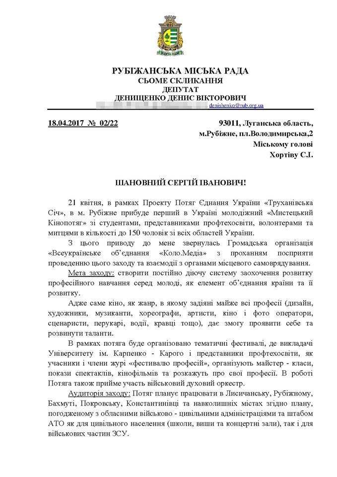 По этому поводу к депутату Рубежанского горсовета Денису Денищенко обратилась Общественная организация «ВО "Коло.Медіа" с просьбой оказать содействие проведению этого мероприятия и взаимодействия с органами местного самоуправления.