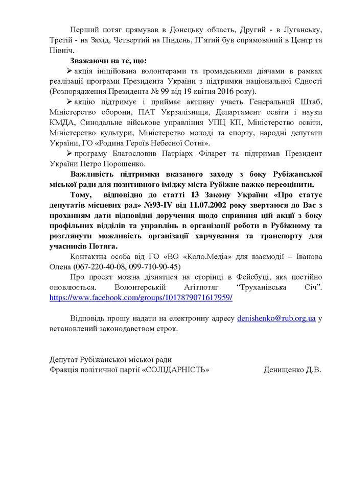 В связи с этим Денищенко обращается к городскому голове Рубежного Сергею Хортиву с просьбой дать соответствующие поручения по содействию этой акции со стороны профильных отделов и управлений в организации работы в Рубежном и рассмотреть возможность организации питания и транспорта для участников Поезда.