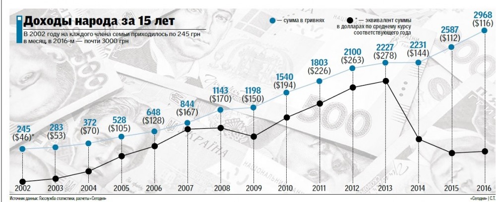 В 2002 году официальный доход каждого приравнивался $46 при курсе 5,3 грн/$, а в 2016 — $116 при курсе 25,6 грн/$. Соответственно дозоды в долларах выросли — 2,4 раза,и совсем не в 12.