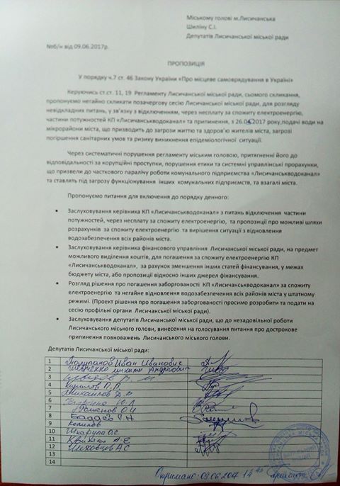 По результату деятельности руководства города, провели совещание с депутатами и приняли решение инициировать досрочное прекращение полномочий Лисичанского городского головы Шилина, за доведение коммунальных предприятий до краха, город более 10 дней без воды, за отсутствие желания провести инвентаризацию и аудит этих предприятий и противодействие депутатам, за протокол о коррупции, за постоянное хамство на сессиях в отношении депутатов и присутствующих, за нарушение регламента, то закрытия сессии не законные, то не вынесение в повестку дня вопросов и т.д., за нападение на депутата и просто работу в ущерб интересам города, и доведение его до гуманитарной катастрофы. Вопросы погашения за воду так и не решены, город продолжает находится в состоянии угрозы отключения энергоснабжения всего водоканала. Опять без воды? Дальше что, без тролейбусов, без тепла и т.д.?