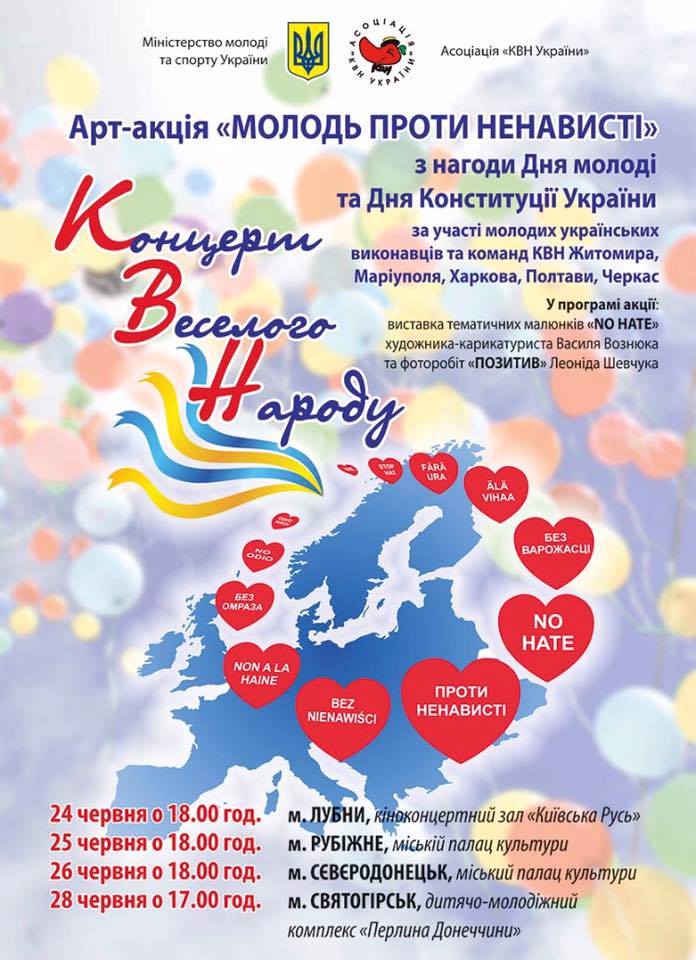 Сегодня, 26 июня, в 18.00 в рамках празднования Дня молодежи и Дня Конституции Украины, пройдет арт-акция «Молодежь против ненависти», при участии молодых исполнителей и команд КВН из Житомира, Мариуполя, Харькова, Полтавы и Черкасс.