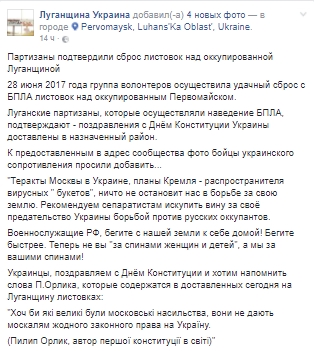 28 июня, группой волонтеров был осуществлен удачный сброс с БПЛА листовок над оккупированным Первомайском Луганской области.