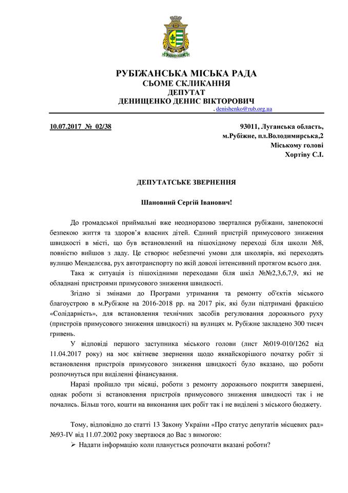 В ответе первого заместителя городского головы (письмо №019-010 / 1262 от 11.04.2017 года) на апрельское обращение депутата Рубежанского городского совета Дениса Денищенко о скорейшем начале работ по установке устройств принудительного снижения скорости было указано, что работы начнутся при выделении финансирования.