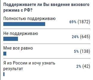 Из 2693 человек 1868 (69%) высказались за введение визового режима. Против проголосовали 645 человек (24%). Для 138 респондентов (5%) данный вопрос не имеет значения. В опросе также приняли участие россияне (2%), которые пожелали узнать мнение украинцев.