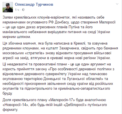 По его словам, заявление "вождей" ОРДЛО о создании "Малороссии" служит очередным доказательства агрессивных планов президента РФ Владимира Путина и его маниакального нежелания решать вопросы мирным путем.