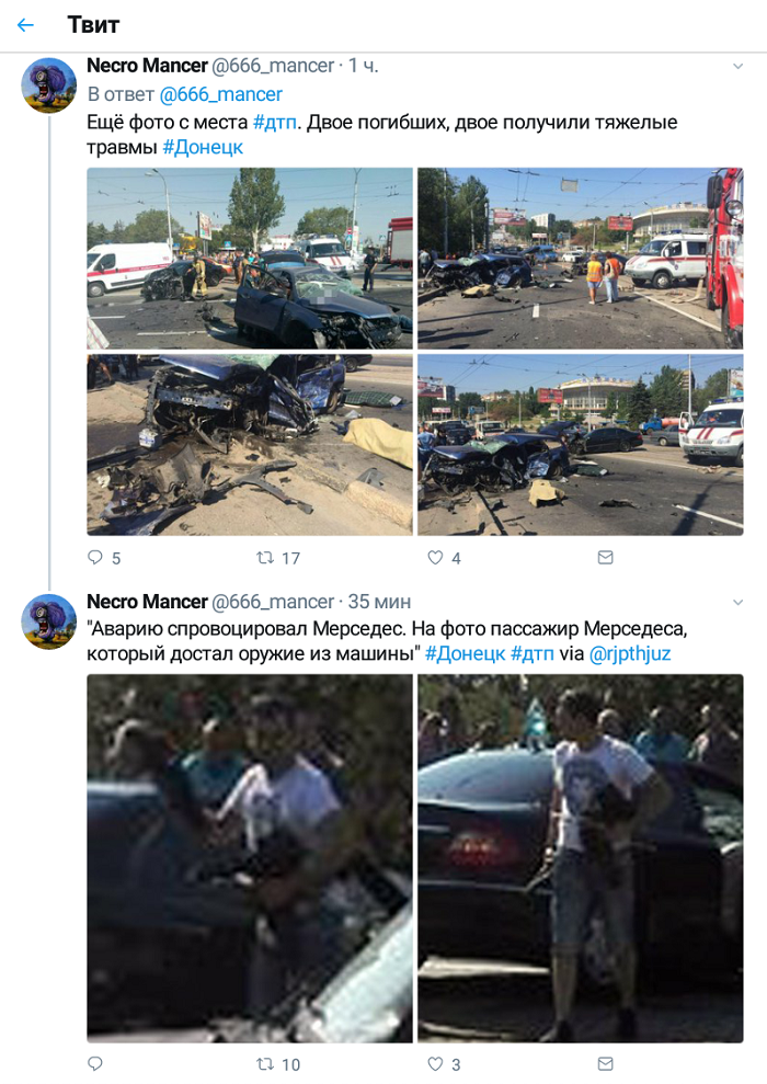 Как сообщает Necro Mancer, в своем аккаунте в Twitter, сегодня в Донецке на Ленинском проспекте произошла автомобильная авария. Двое умерли на месте, еще двое ранены.