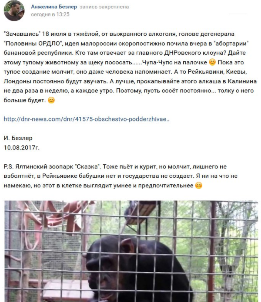 "Пока это тупое создание молчит, оно даже человека напоминает. А то Рейкьявики, Киевы,Лондоны постоянно будут звучать. А лучше, прокапывайте этого алкаша в Калинина не два раза в неделю, а каждое утро", - пишет "Бес".