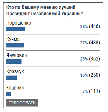 По мнению читателей лучший Президент Украины – Петр Порошенко. Он набрал 28% голосов.