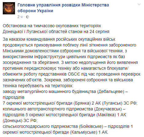 По данным разведки вооружение и военная техника находиться на территории заводов и предприятий в Дебальцево, Брянке, Луганске, Докучаевске, Макеевке и Донецке.