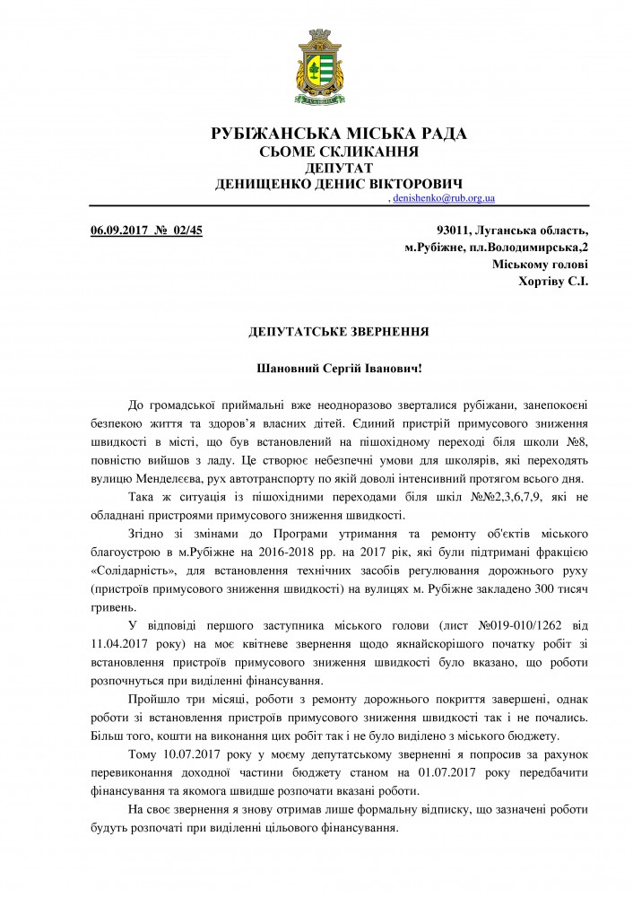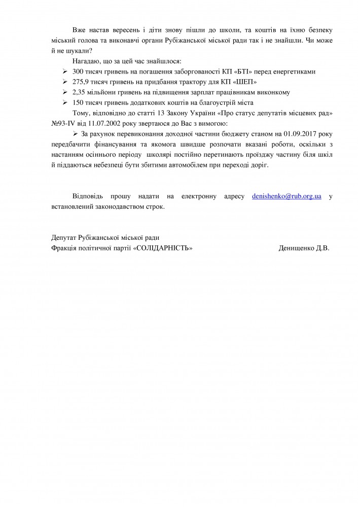 В святи с этим Денищенко обращается к городскому голове Рубежного Сергею Хортиву с требованием предусмотреть финансирование и как можно скорее начать указанные работы за счет перевыполнения доходной части бюджета по состоянию на 01.09.2017 года, поскольку с наступлением осеннего периода школьники постоянно пересекают проезжую часть возле учебных заведений и подвергаются опасности.
