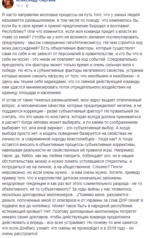 В соцсети Ходаковский пишет, что часто размышляет о том, что изменилось бы прими он в свое время предложение Бородая возглавить группировку.