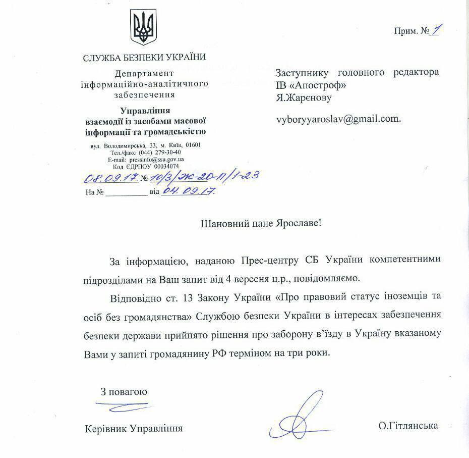 Об этом сообщает "Апостроф", ссылаясь на документ предоставленный изданию СБУ.