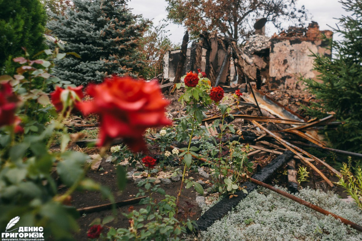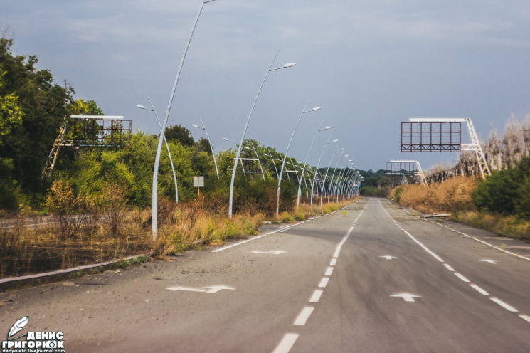 Пустое Авдеевское шоссе. Всюду то, что осталось от фонарей и бигбордов. Всюду сорняки, поврежденные снарядами деревья. Дорога в осколках...Среди жутких развалин растут розы.