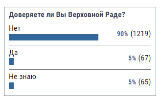 В опросе приняли участие 1351 человек. Из них всего 67 человек (5%) доверяют народным избранникам, 65 человек (5%) не смогли дать однозначный ответ. Подавляющее большинство респондентов единственному органу законодательной власти в Украине не доверяют. Так, за вариант "нет" проголосовали 1219 человек (90%).