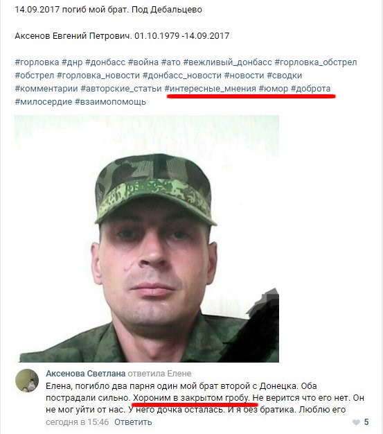 Как сообщает сестра Аксенова в соцсети, боевика хоронили в закрытом гробу.