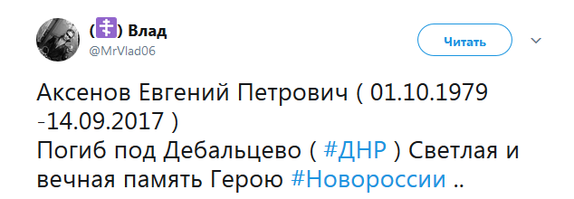 14 сентября в окрестностях оккупированного Дебальцево были ликвидированы двое российских наемников. Один из них - Евгений Аксенов, 1979 года рождения, имя второго не называют.