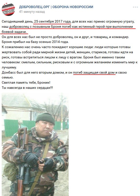 Как сообщает "Трибун" со ссылкой на блогера Necro Mancer, боевик из Элисты (Республика Калмыкия, РФ) Санал Викторов по кличке "Броня" был ликвидирован 25 сентября текущего года.