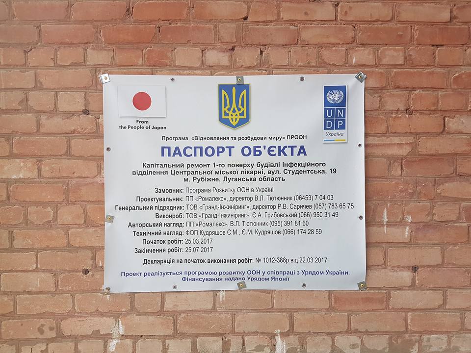 По информации директора департамента внешних отношений, внешнеэкономической и инвестиционной деятельности Луганской облгосадминистрации Дениса Денищенко, благодаря совместным действиям ПРООН и Луганской ВГА в конце октября в Рубежном появится одно из лучших инфекционны отделений в стране.