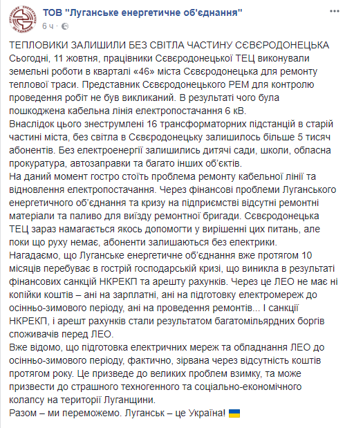 «Из-за финансовых проблем ЛЭО и кризиса на предприятии отсутствуют ремонтные материалы и топливо для выезда ремонтной бригады. Северодонецкая ТЭЦ сейчас пытается как-то помочь в решении этих вопросов, но пока движения нет, абоненты остаются без электричества», - рассказали в пресс-службе ЛЭО.