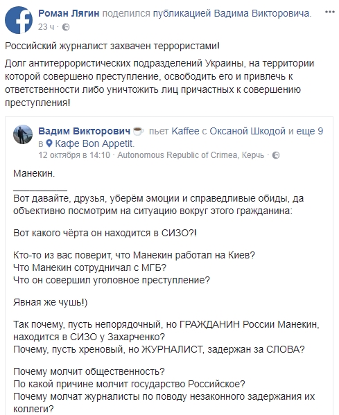 Так, Лягин пишет: "долг антитеррористических подразделений Украины, на территории которой совершено преступление, освободить его и привлечь к ответственности либо уничтожить лиц причастных к совершению преступления!"