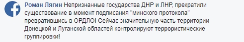 "Непризнанные государства "ДНР" и "ЛНР", прекратили существование в момент подписания "минского протокола" превратившись в ОРДЛО! Сейчас значительную часть территории Донецкой и Луганской областей контролируют террористические группировки!, - пишет он.