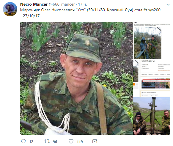 Также стало известно о ликвидации Мирончука Олега Николаевича с позывным "Ухо". Предположительная дата смерти наемника 27 октября 2017 года.