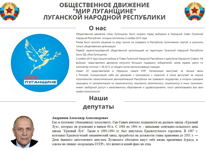 "Мир Луганщине" был организован накануне выборов в "народный совет" фейковой "республики". Фактически "Мир Луганщине" под контролем главаря группировки "ЛНР" Игоря Плотницкого.