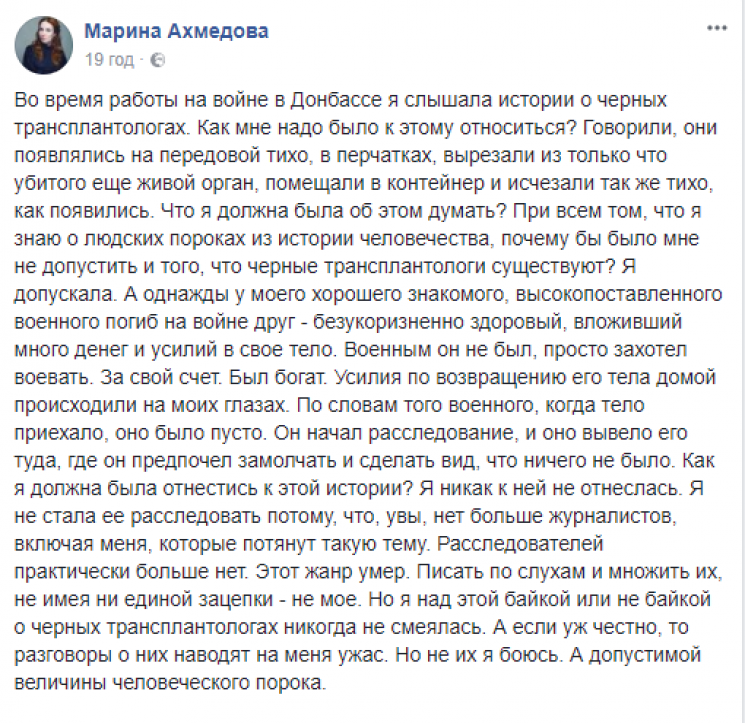 По словам Ахмедовой, она неоднократно слышала в ОРДЛО "байки" о "черных трансплантологах", но никаких доказательств не находила. Однако, недавно ее знакомый поведал историю гибели своего друга и о расследовании, которое вывело его "туда, где он предпочел замолчать и сделать вид, что ничего не было".