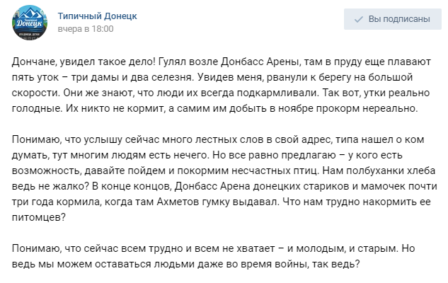 "Я бы хотел добавить, что подкармливать можно не только птиц но и животных которые по той или иной причине оказались на улице, им сейчас и так трудно выжить из за холодов! Для нас это будет мелочь а для животных шанс выжить. Оставайтесь людми не смотря ни на что".