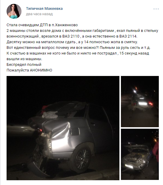 "Ехал пьяный в стельку военнослужащий, врезался в ВАЗ 2110, а она естественно в ВАЗ 2114. "Десятку" можно на металлолом сдать, а у 14 полностью "ж*па" в смятку", - пишет женщина.