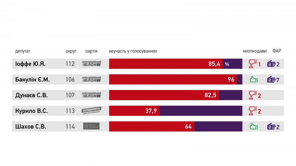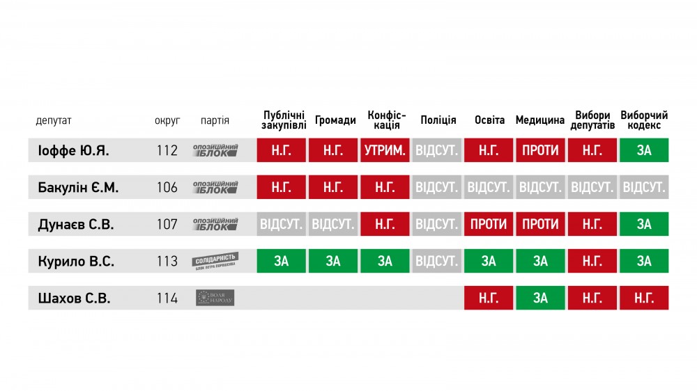Щоб з’ясувати ставлення депутатів до реформаторських ініціатив, Громадський рух ЧЕСНО обрав 8 законопроектів, щодо яких голосували депутати парламенту 8-го скликання: Закон про публічні закупівлі, Закон про добровільне об’єднання територіальних громад, Закон про національну поліцію, Закон стосовно удосконалення процедури арешту майна та інституту спеціальної конфіскації, Закон про освіту, Закон про державні фінансові гарантії надання медичних послуг та лікарських засобів, Закон про вибори народних депутатів України і Виборчий кодекс України. Таблиця голосувань мажоритарників області наведена нижче.
