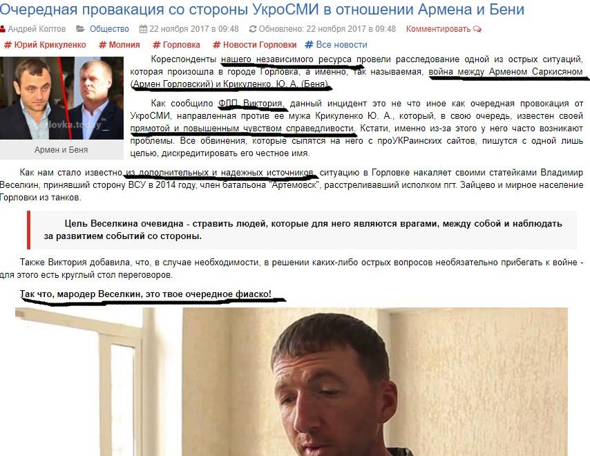 Потом Армену надоело воевать с Беней из-за того, что об этом пишут на проукраинских сайтах. Они временно помирились и сделали виновным Владимир Веселкин (Vladimir Veselkin), председателя военно-гражданской администрации Зайцево.