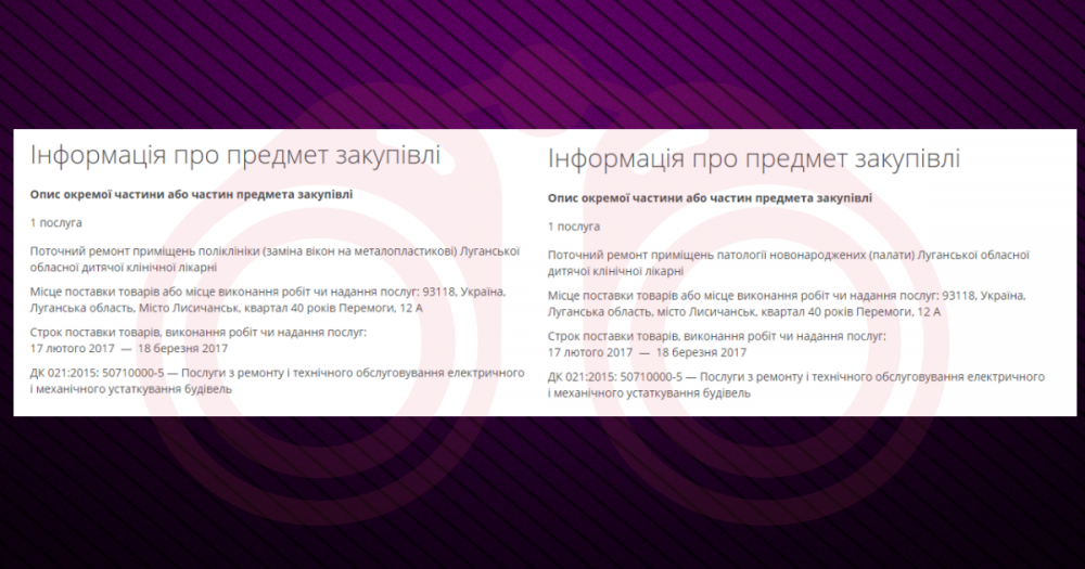 В іншому випадку дитяча лікарня могла подробити закупівлю. В лютому в один день “Газ-тепло плюс” уклав два майже ідентичні договори. Перший про “ремонт приміщень патології новонароджених (палати)” та другий про “ремонт приміщень поліклініки (заміна вікон на металопластикові)” - по 199 899,99 тис. грн. В закупівлях однаковий CPV код, строки, звіти оприлюднені та договори укладені майже одночасно, однакова допорогова сума та адреса об’єкту.