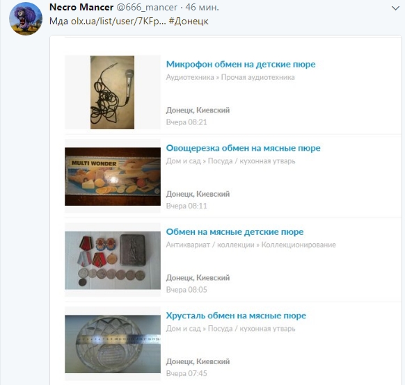 Блогер Necro Mancer опубликовал скриншот с сайта OLX, с объявлениями жителей Киевского района оккупированного Донецка.