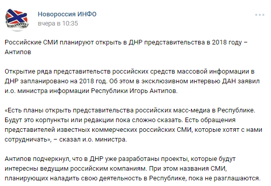 Мирится с этим «великая» держава не может. Как сообщает один из сепаратистских ресурсов открытие ряда представительств российских средств массовой информации в «ДНР» запланировано на 2018 год. Об этом, с огоньком в глазах, заявил и.о. министра информации квазиреспублики Игорь Антипов.