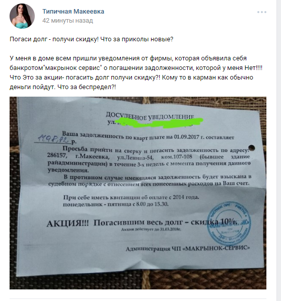 У меня в доме всем пришли уведомления от фирмы, которая объявила себя банкротом "Макрыном сервис" о погашении задолженности, которой у меня НЕТ!!! Что это за акции - погасить долг и получить скидку?! Кому-то в карман, как обычно деньги пойдут. Что за беспредел?!", - сказано в сообщении.