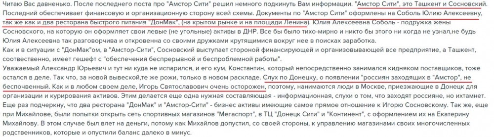 Как пишут в сообществе "О ДНР" в LiveJournal, "Амстор сити" контролируется так называемым "министром доходов и сборов" группировки "ДНР" Александром Тимофеевым по кличке "Ташкент", а также Игорем Сосновским (бывший советник экс-премьер-министра Украины Николая Азарова).