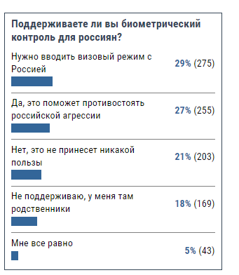 Всего проголосовало 945 человек. Из них, согласно полученным данным, сторонников введения визового режима для граждан РФ – 275 человек (29%). Немного меньше, 255 человек (27%) поддерживает биометрический контроль для россиян, так как это поможет противостоять российской агрессии; 203 участника опроса (21%) не одобряет появления контроля, так как это не принесет никакой пользы; 169 респондентов (18%) также не поддержали данную инициативу, поскольку имеют родственников в России. И 43 человека (5%) безразличны к данному вопросу.