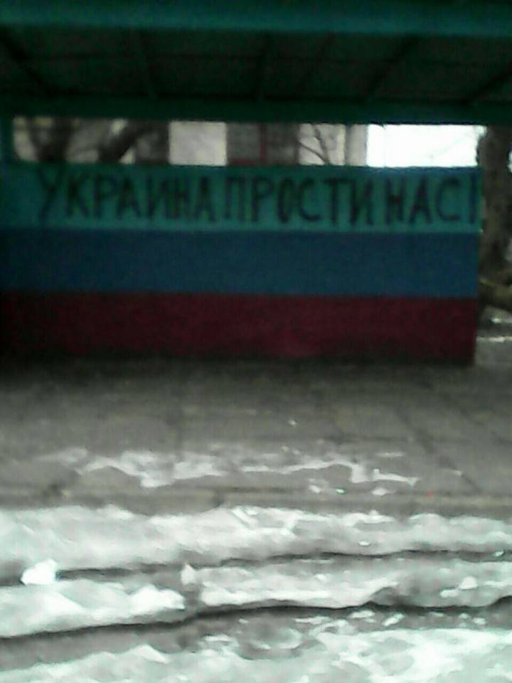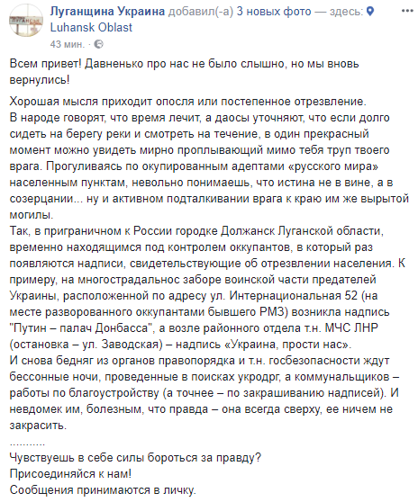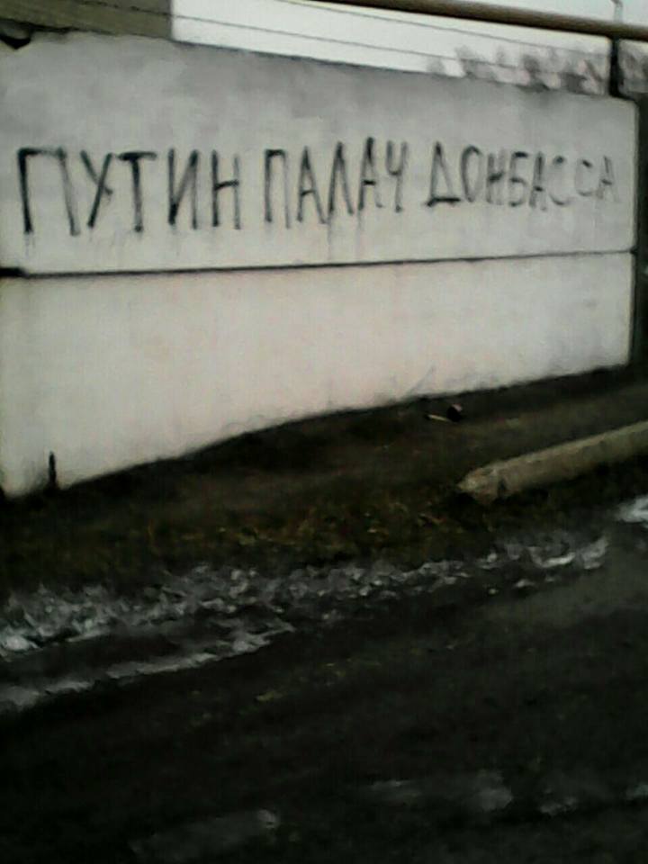 Так, в сообщении сказано, что надпись "Путин - палач Донбасса" возникла на заборе одной из воинских частей НВФ, а возле райотдела т.н. "МЧС ЛНР" на ул. Заводской появилась надпись "Украина, прости нас".