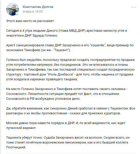 "Арест санкционировали глава ДНР Захарченко и его "кошелек", вице-премьер по экономике Тимофеев (он же "Ташкент")", - пишет Долгов.