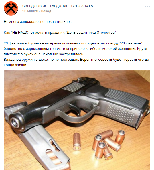 23 февраля в Луганске во время домашних посиделок по поводу "23 февраля" баловство с заряженным травматом привело к гибели молодой женщины. Крутя пистолет в руках она нечаянно застрелилась...