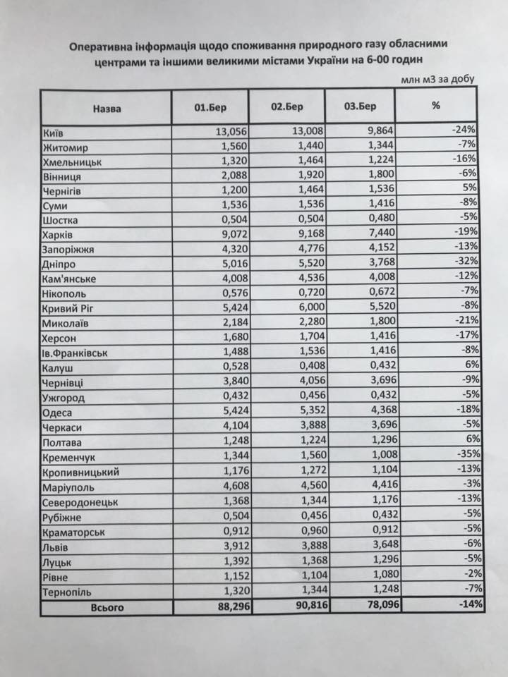 Глава компании «Нафтогаз Украина» Андрей Коболев на своей странице в Facebook опубликовал список, в котором указано, на сколько крупные города Украины сократили потребление газа в течение первых трех дней марта